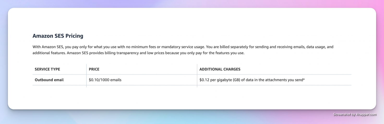 | [Amazon Simple Email Service Pricing | Cloud Email Service | Amazon Web Services](https://aws.amazon.com/ses/pricing/) |