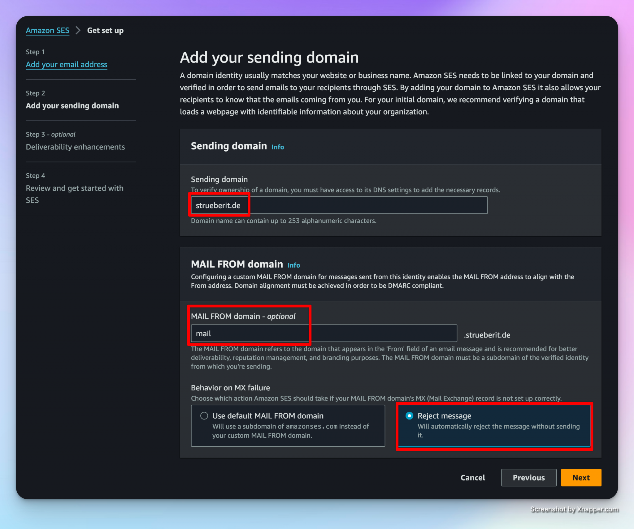 Now you need to add your sending domain. For better deliverability, the service recommends defining a mail from domain that is a subdomain of your primary domain. In my case, I choose “mail” as subdomain. In case of an MX error, we choose to reject the message: