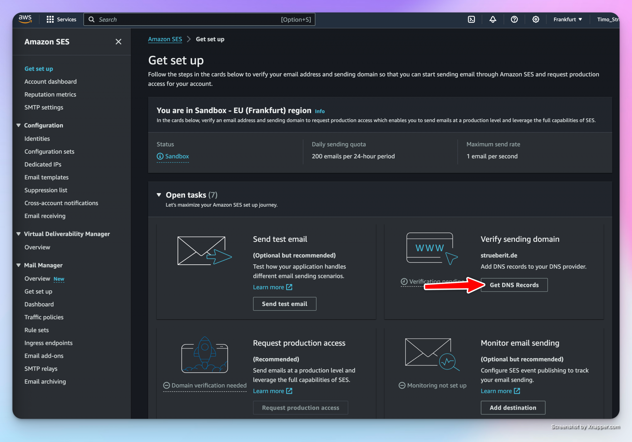 Now you need to set up your sending domain, so go to the Amazon SES service and click on “Get DNS Records”: