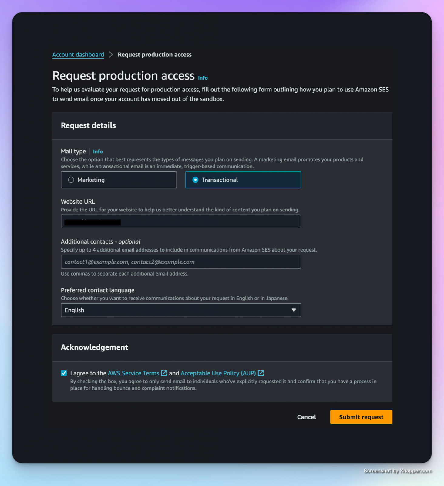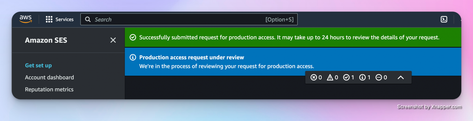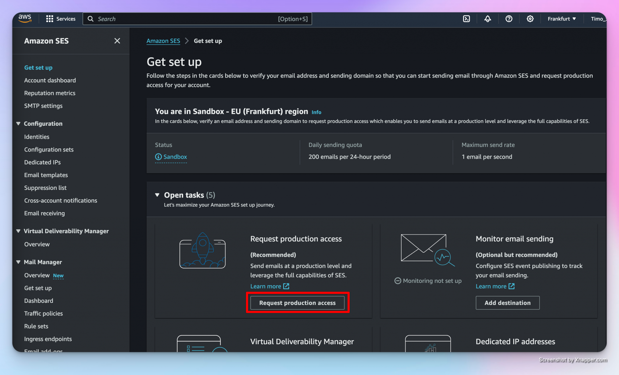 Since the account is currently in the sandbox state, we need to request production access to remove the restrictions that are currently in place: