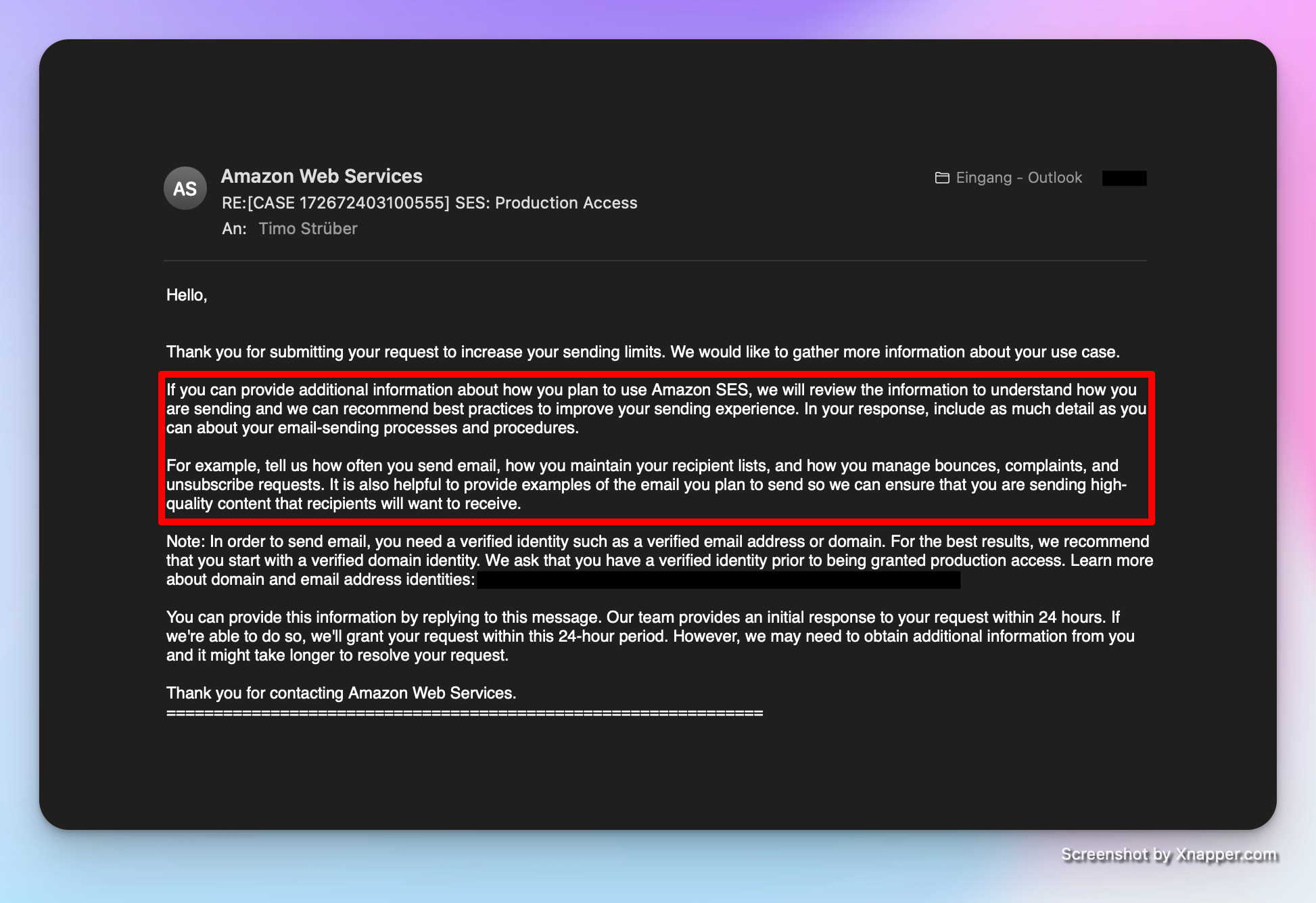 This distinguishes the AWS service from other providers, where you usually have a free tier that you can use to set up the service, but after that you have to pay about 20-30€ per month to get a usable service. So the AWS service is especially cheaper for small businesses, but also if you are a big company sending thousands of emails: