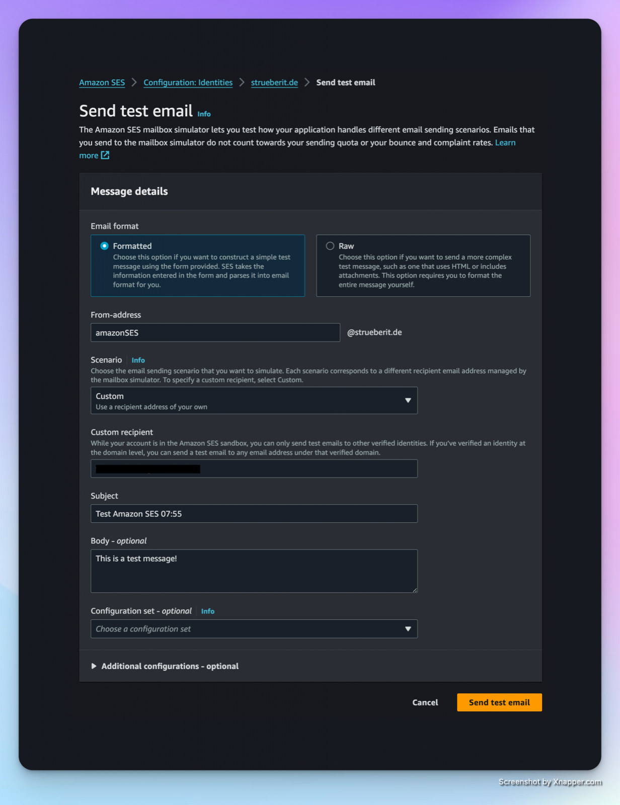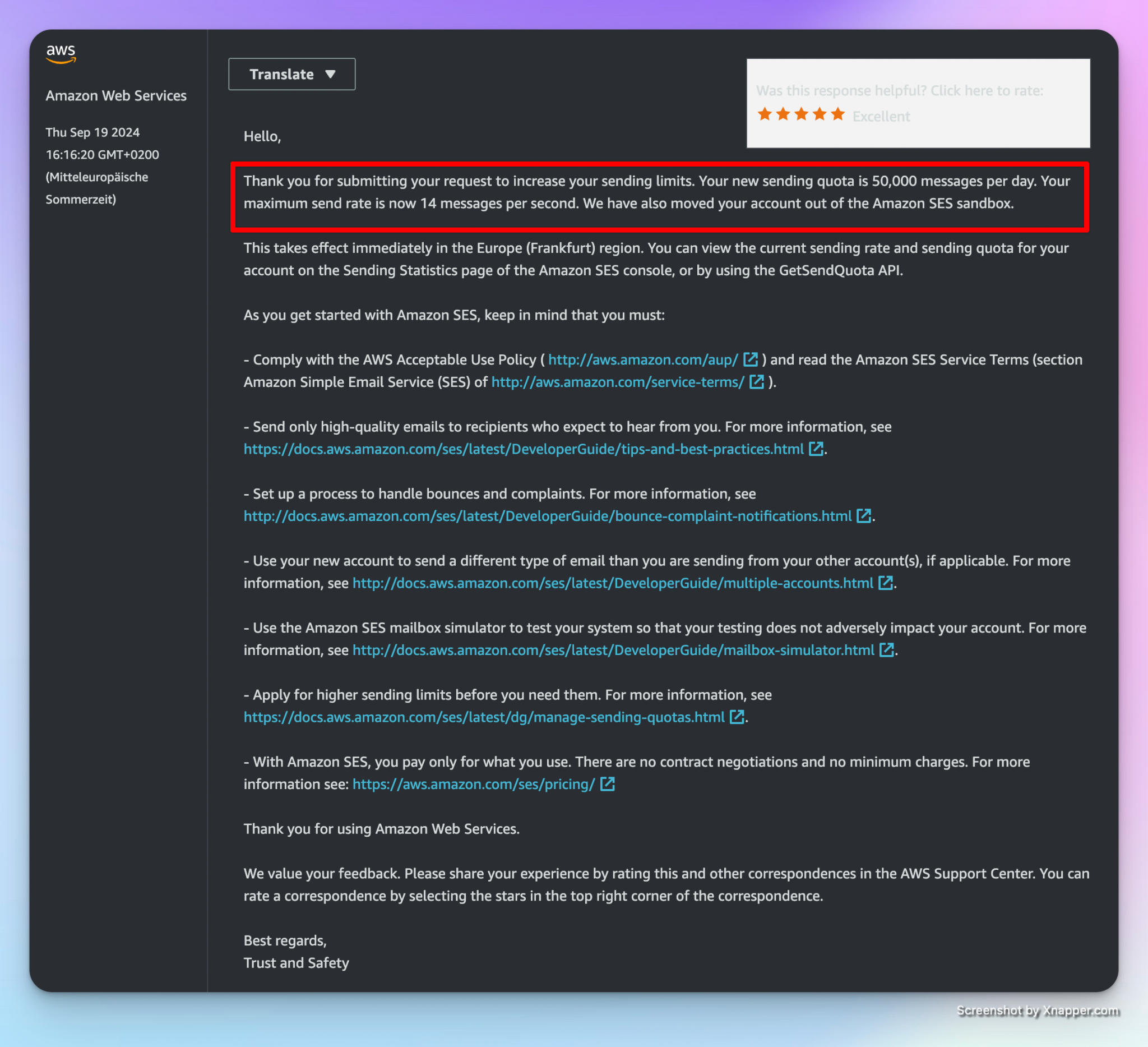 An advantage of the service is that you can choose in which region your Simple Email Service will be hosted. Here you can choose a German region like Frankfurt am Main. This is different from other services like SendGrid where the servers are hosted in america or Mailjet where the servers are hosted in france. if you need to comply with regulatory requirements like hosting the service in german datacenters then this is a service to look into.