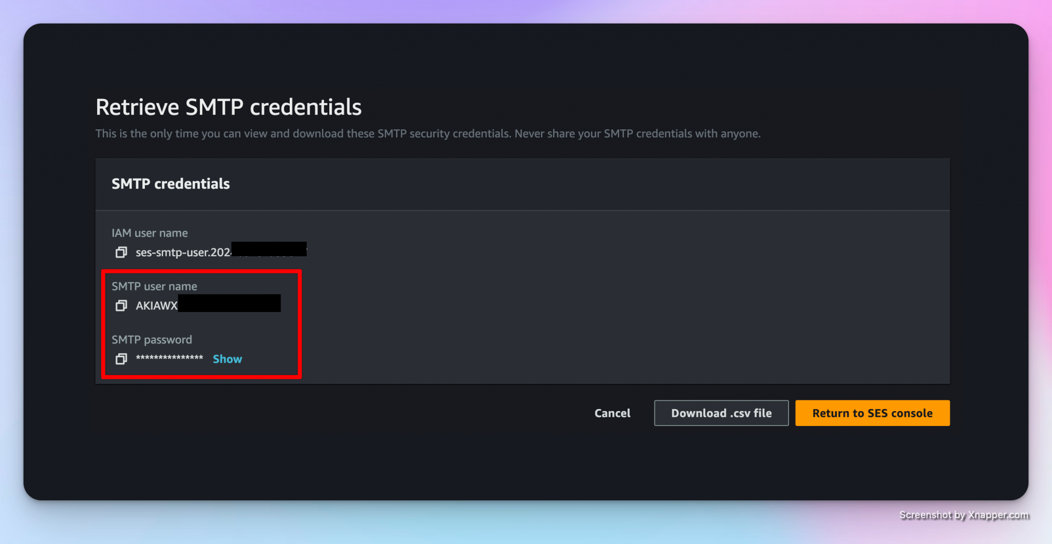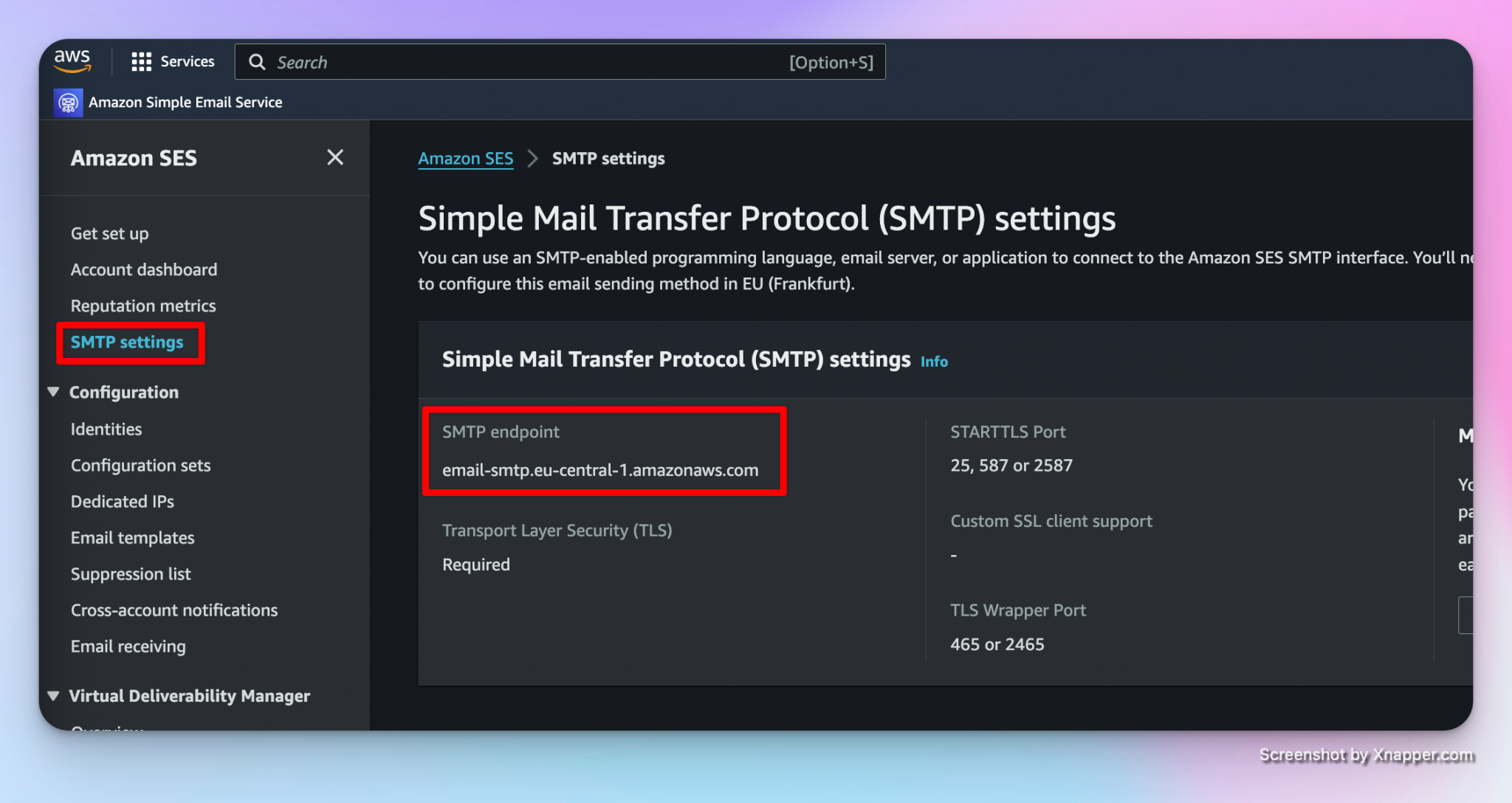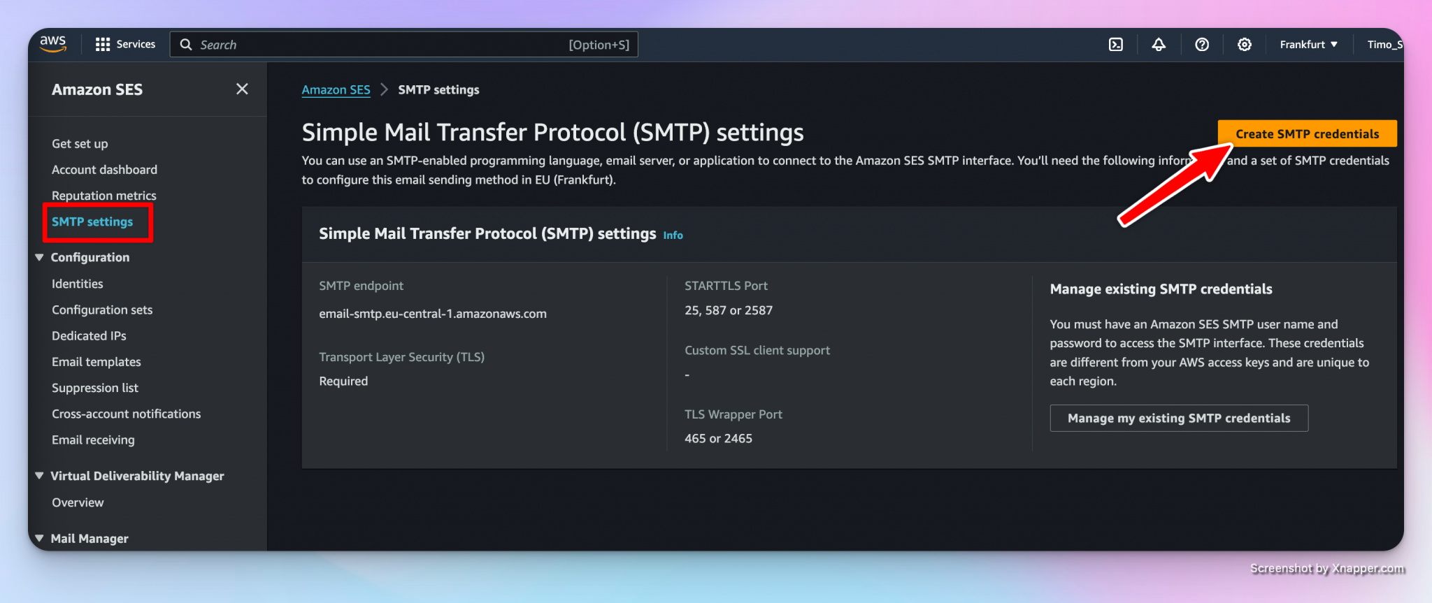 #send via SMTP # Define username and password $smtpUserName = '<username>' $smtpPassword = ConvertTo-SecureString '<password>' -AsPlainText -Force # Convert to SecureString [pscredential]$credential = New-Object System.Management.Automation.PSCredential ($smtpUserName, $smtpPassword) # Send Email - change the values if needed. Send-MailMessage -Credential $credential ` -useSSL ` -smtpServer 'email-smtp.eu-central-1.amazonaws.com' ` -port 587 ` -from 'amazonSES@strueberit.de' ` -to 'timo.strueber@outlook.com' ` -subject 'Email via Amazon SES SMTP Endpoint' ` -body 'Email via Amazon SES SMTP Endpoint' The smtp server details can be found here: