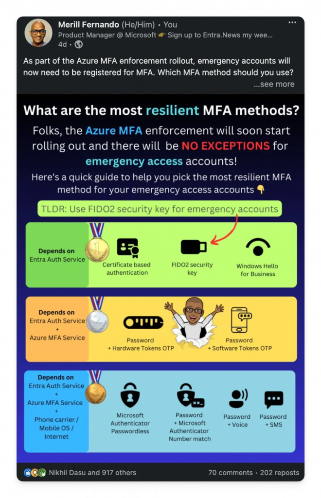 Beginning October 15 Microsoft will tighten their security measures to force every administrative account to use multi factor authentication. So you must protect the two break glass accounts with a second factor as well. I really like the idea of protecting your break-glass accounts with FIDO2 keys, as Merill Fernando suggests. You will get a passwordless & phishing resistant authentication solution for the accounts that only depends on the Entra Authentication service.