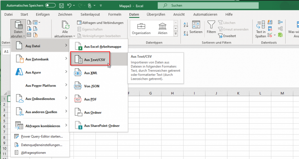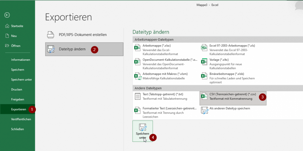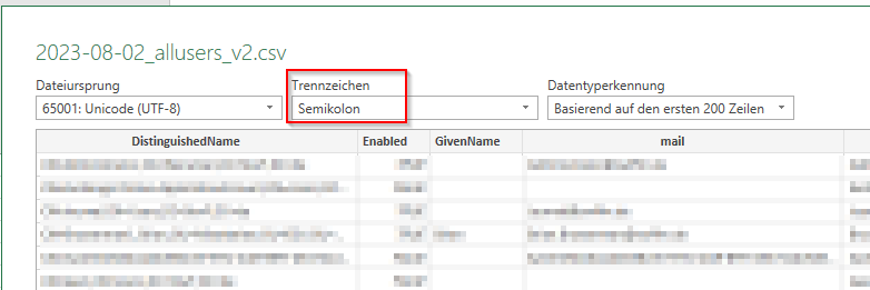You then have to change the separator to match the output csv file - in my example “;” or “Semikolon” in german:
