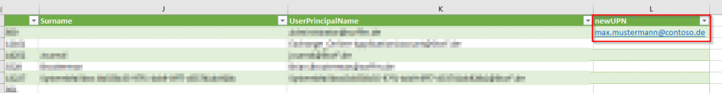 As we will use each user’s E-Mail address as the new UPN we can copy over the address where it is correctly set. On some users there is still some manual work to do. I recommend involving the customer in working on the table or at least let him check it after completion.