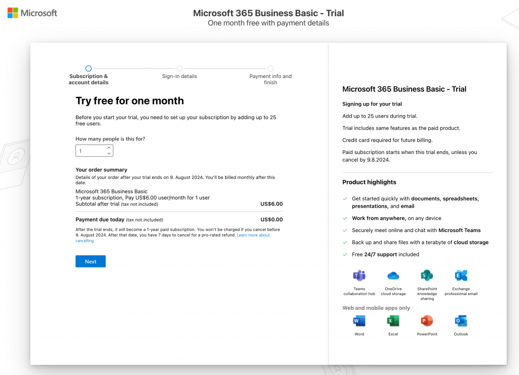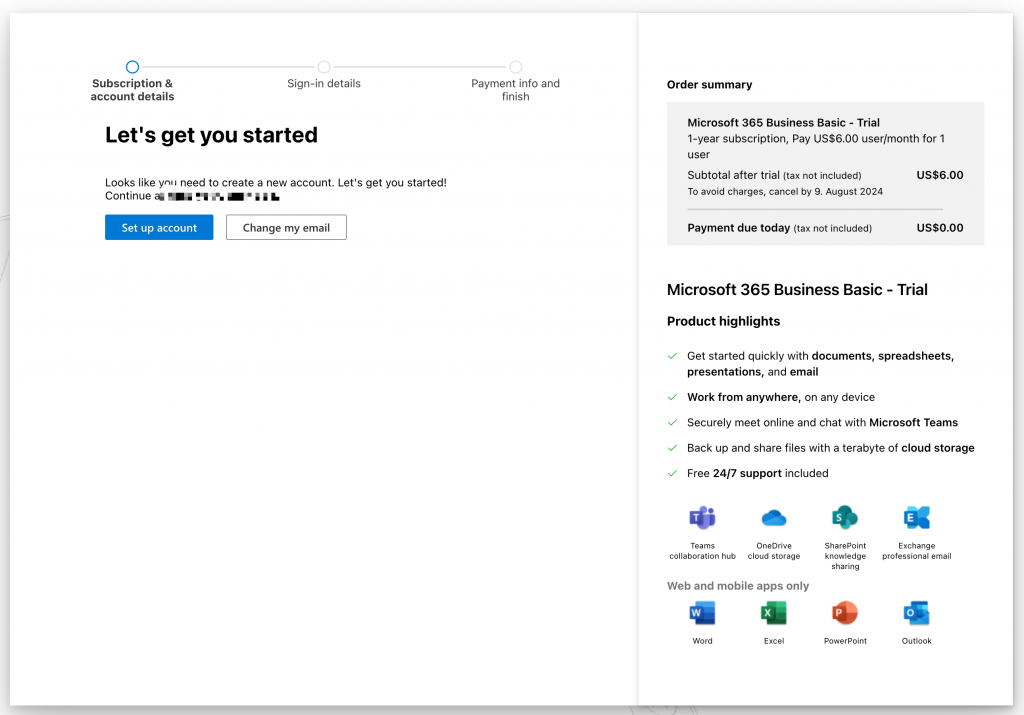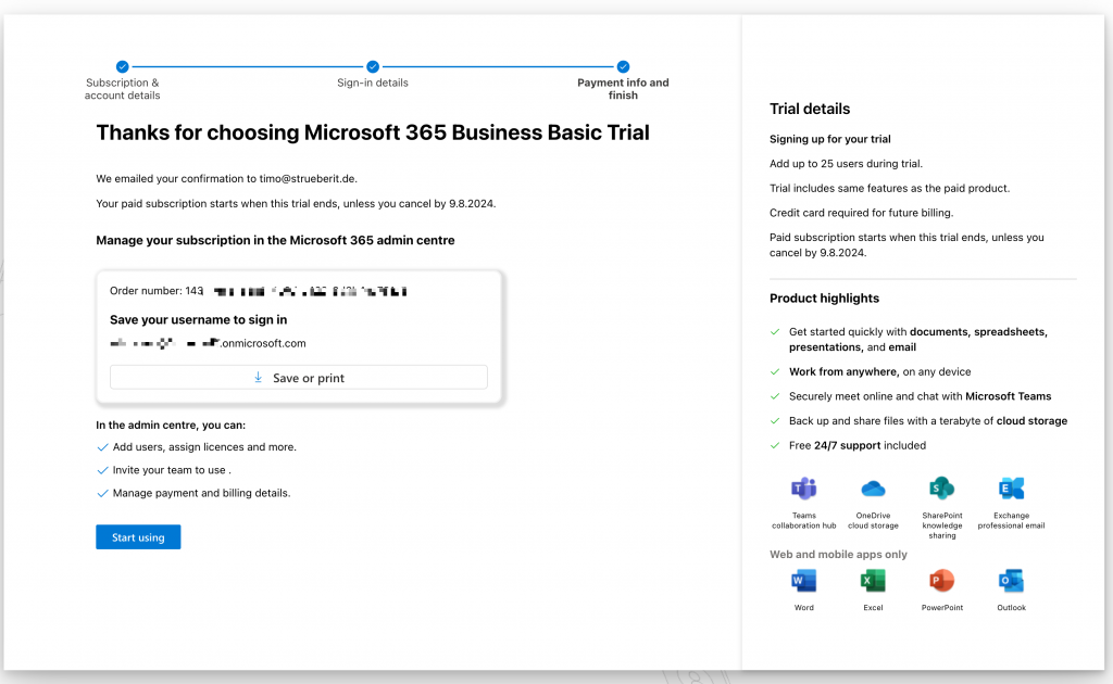 Now, back to the article. Because I work for a big company, I almost never went through the Microsoft 365 Tenant Creation Process on my own. In today’s blog, I’ll show you how to create a Microsoft 365 tenant based on the Business Basic License, starting with free trial licenses. I figured this might be useful for someone to cover. In the next few articles, I’ll go into more detail about the first steps to take in a freshly created tenant to set it up and basically secure it.