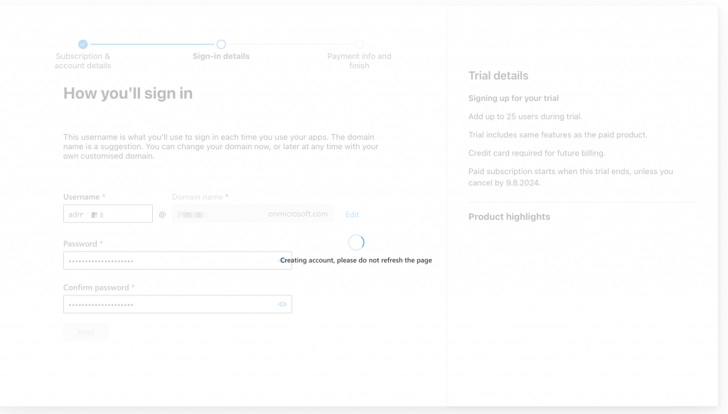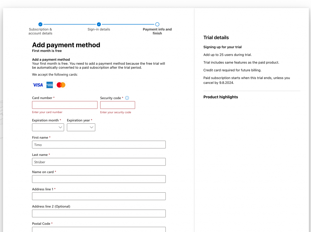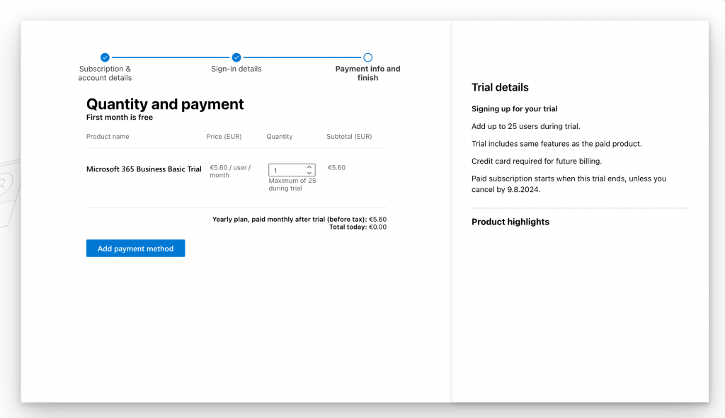 To not generate excessive costs in case I miss to cancel my subscription I choose the Busines Basic License that does not include the desktop versions of the office products. This license also lacks enhanced security features that are only included in the Business Premium license. When creating a tenant for a company I would always recommend choosing the Business Premium license because of the included security features! In a separate article I will cover the different license plans and how to compare them.