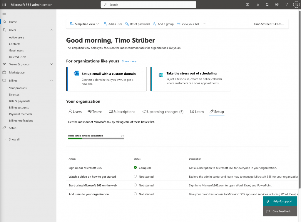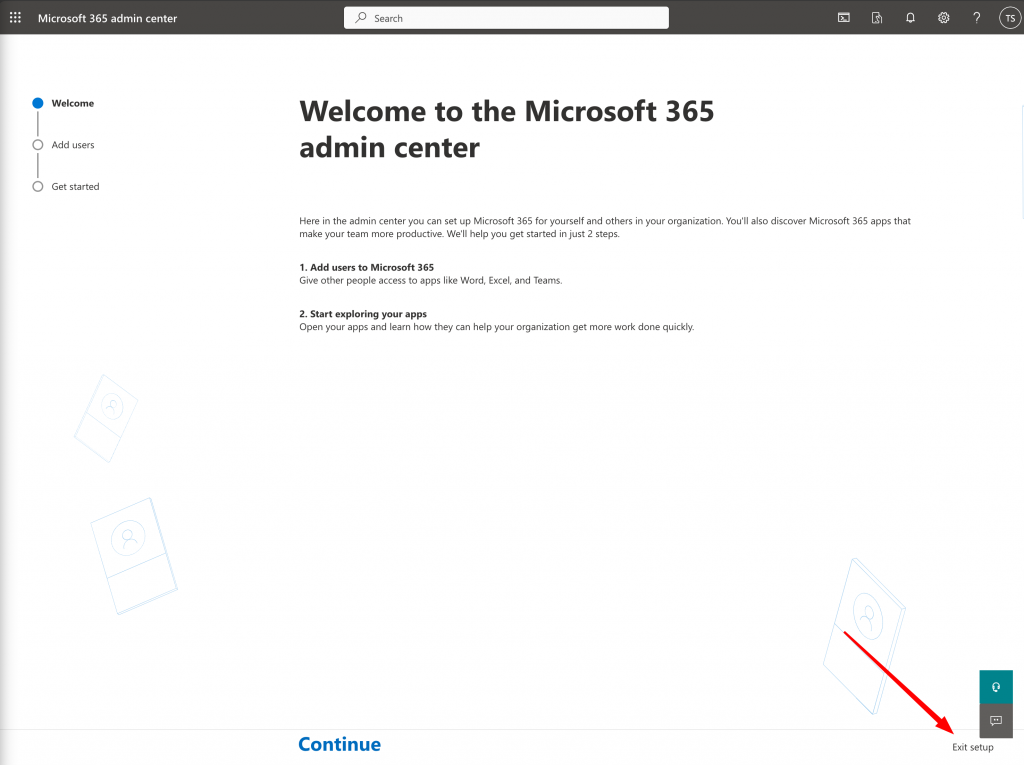 Click on “Start using” to get redirected to the Microsoft 365 Admin Center.
