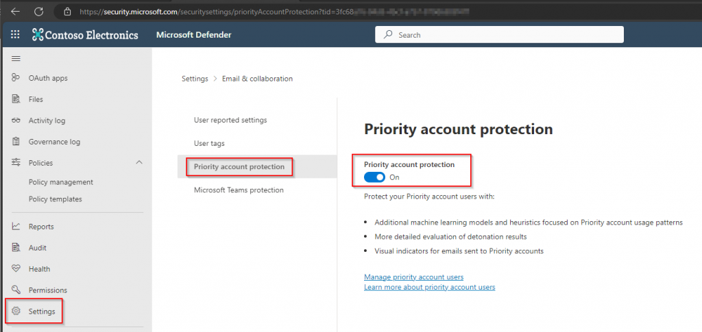The next step is to identify the priority accounts that require the feature’s protection. The configuration can be found in the same section: