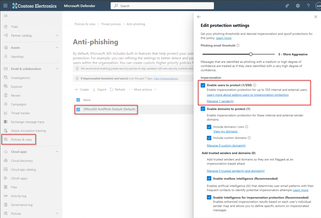 Impersonation protection can be enabled for up to 350 users in your tenant. The configuration can be found within the Defender for Office anti-phishing policies: