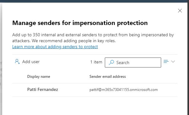 The second feature for protecting priority accounts is “impersonation protection”. This feature guards against attackers who attempt to impersonate employees of your organization. They may send an email from an external email service to another employee of your organization, pretending to be someone they’re not.