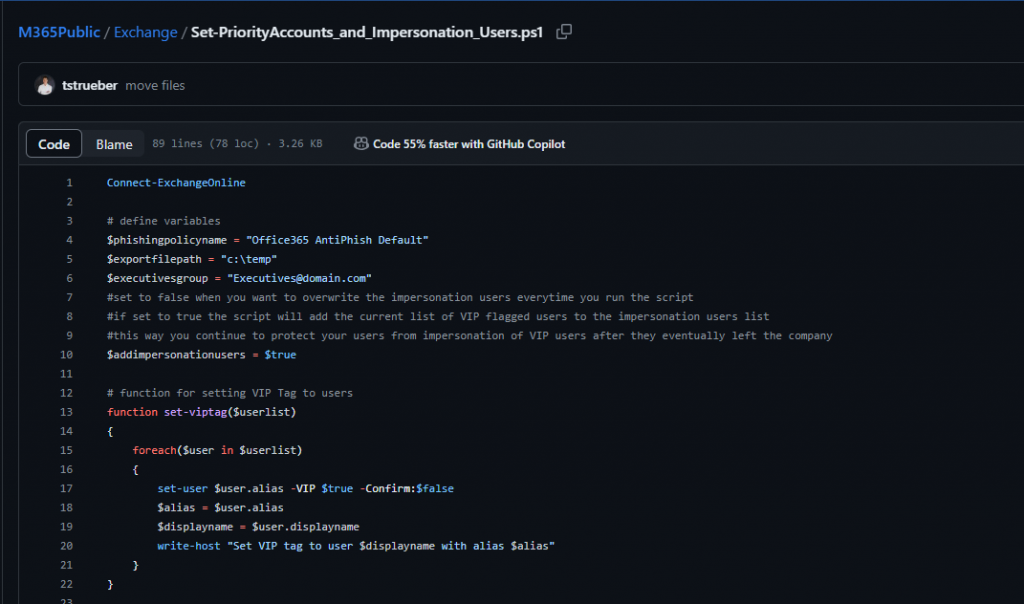 if($addimpersonationusers -eq $true) { #add the new users to the protected users list $TargetedUsersToProtect_combined = $TargetedUsersToProtect_Current + $TargetedUsersToProtect_New #sort out duplicates $TargetedUsersToProtect = $TargetedUsersToProtect_combined | sort-object -Unique #set users to protect Set-AntiPhishPolicy -Identity $phishingpolicyname -TargetedUsersToProtect $TargetedUsersToProtect Write-Host "Adding the new users to protect from user impersonation to the curent list:" $TargetedUsersToProtect } else #overwrite the old list { #set users to protect Set-AntiPhishPolicy -Identity $phishingpolicyname -TargetedUsersToProtect $TargetedUsersToProtect_New Write-Host "overwriting the curent list of users to protect from user impersonation with the new one:" $TargetedUsersToProtect_New } As always here is the link to the complete script on GitHub: