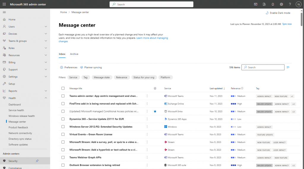 A reliable resource for staying informed about changes in your Microsoft 365 tenant is the message center. This platform notifies you of all updates Microsoft implements on the services enabled in your tenant.