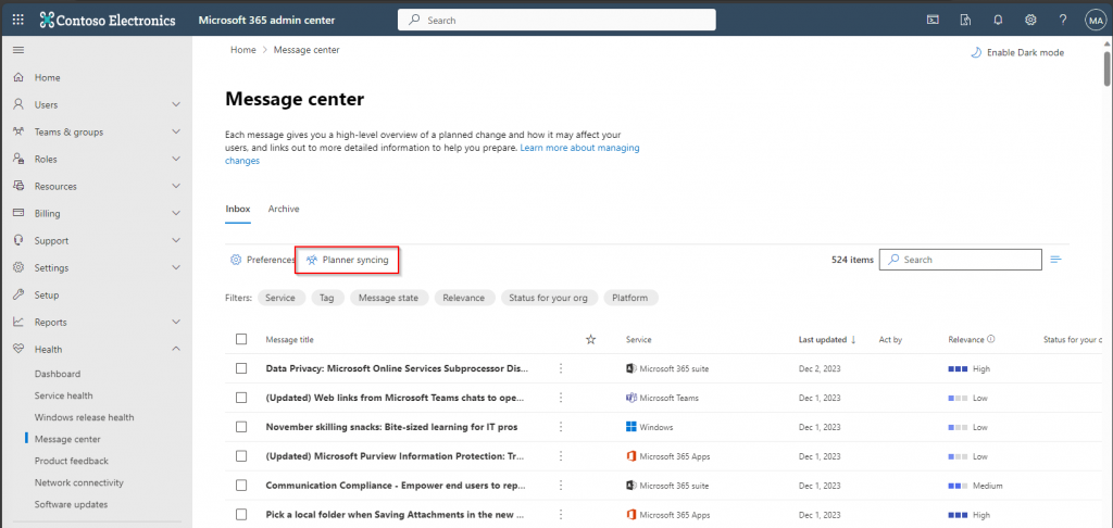 Now that you have set up the plan, you can enable planner syncing in the message center: