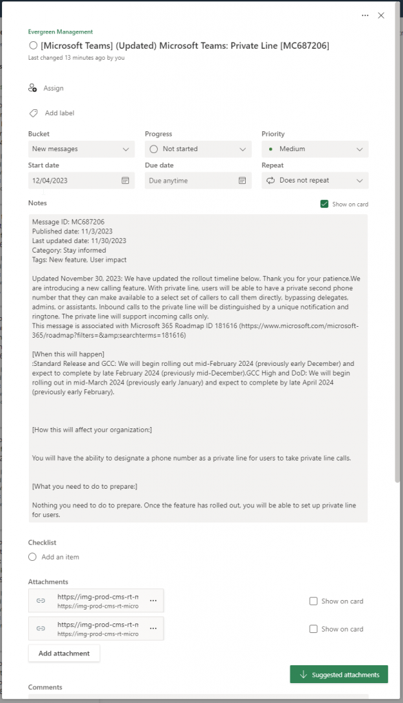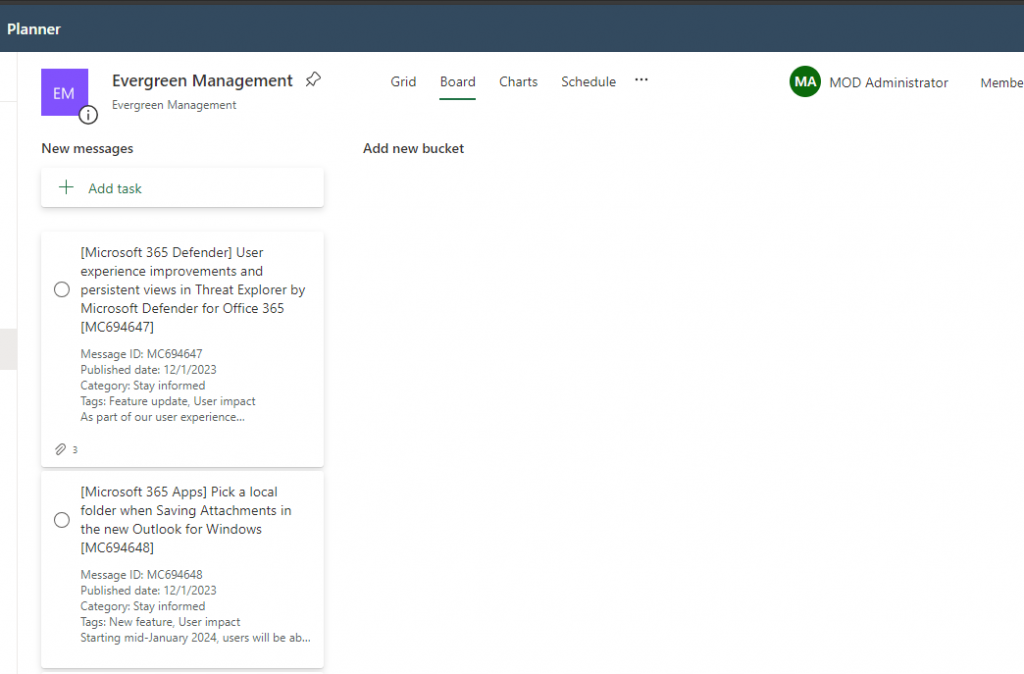 Microsoft offers an alternative option, in addition to the message center, to manage messages. You can establish Planner syncing and forward the messages to a planner board. There you can work through the messages and delegate specific messages to colleagues.