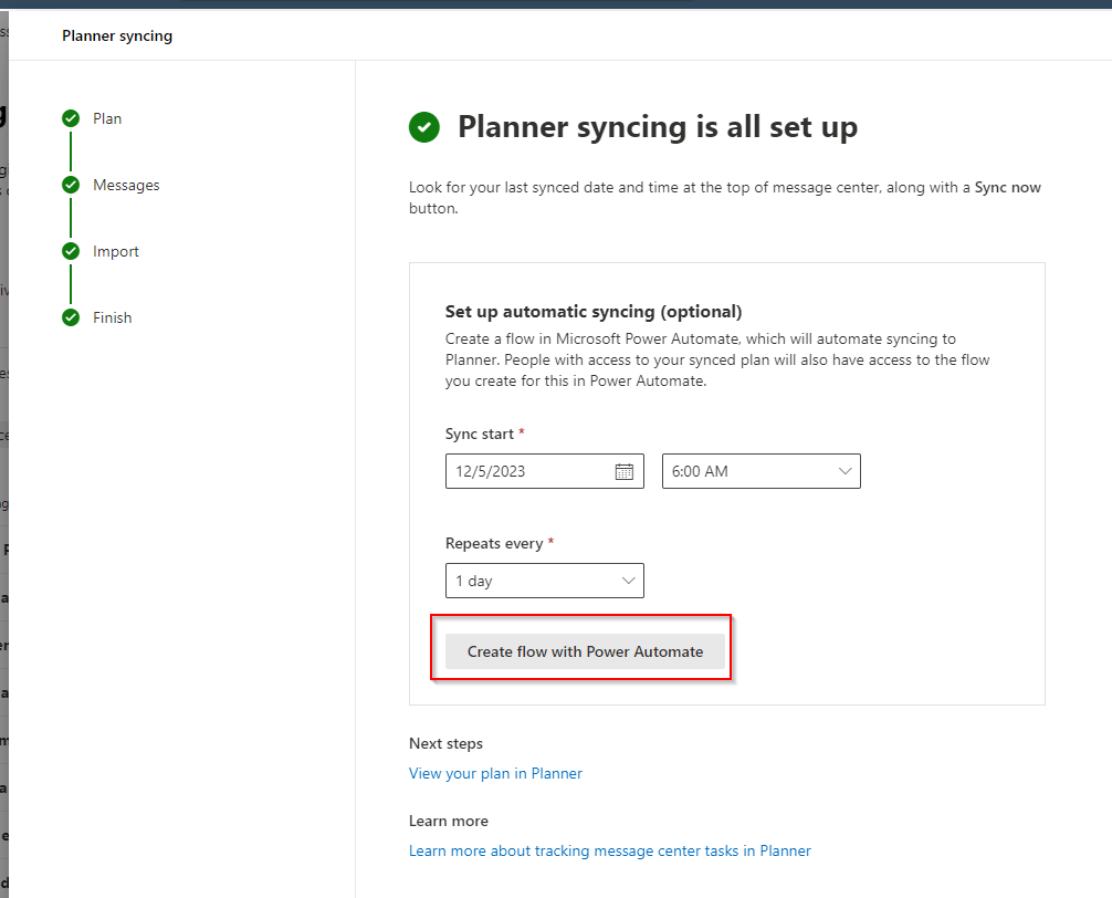 Finally, the wizard offers the option to set up a Power Automate flow for synchronizing the messages to your planner board, which I suggest: