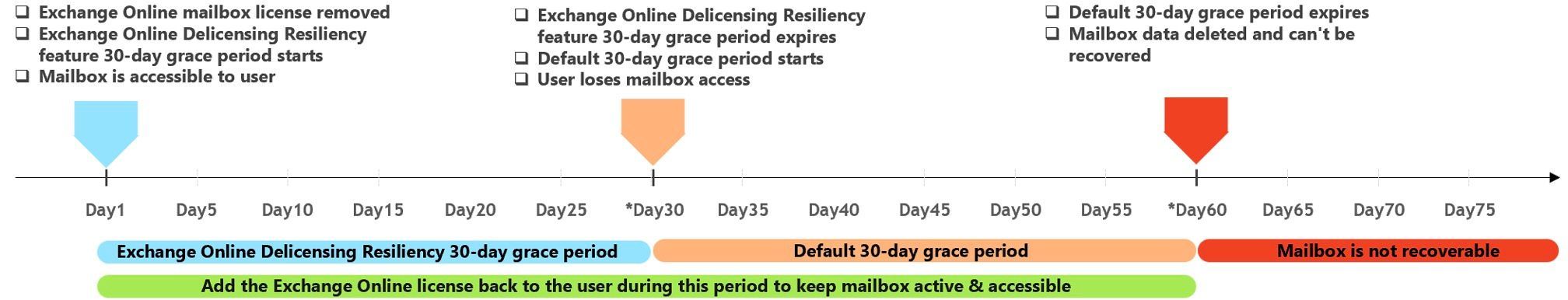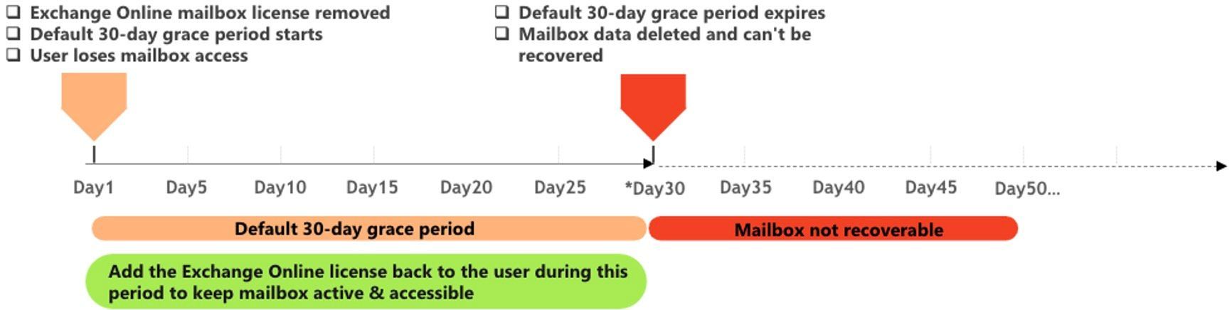 This resiliency feature introduces a grace period that temporarily preserves the mailbox completely after a license is removed. When a user’s mailbox is delicensed, instead of being soft deleted immediately, it stays active for 30 days. During this time, administrators have the opportunity to reassign the license and the mailbox stays active even after the new 30-day grace period is over. After the new grace period the mailbox will we soft deleted and the default grace period of 30 days starts. In the soft deleted state the user cannot access the mailbox anymore. E-mails to the mailbox will result in non-delivery reports (NDRs). By reassigning the license during this period the mailbox becomes active again. When the default 30-day grace period expires the mailbox gets deleted and cannot be recovered.