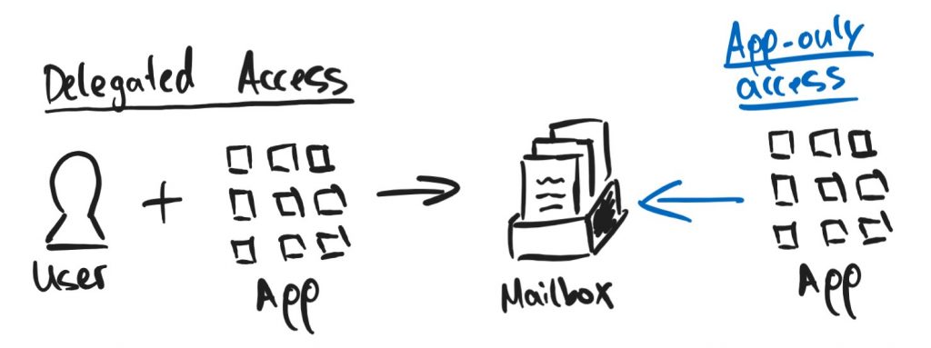 For accessing a mailbox through an application we basically differenciate between delegated access and app-only access. When using delegated access you “access the mailbox on behalf of a user” so you need a real user with username & password to authenticate to. In addition due to security reasons you will also need to provide an additional factor for secure authentication (MFA with Authenticator for example). Because this is not suitable for an application that will run in the background we have the second option. That option is called app-only access! In this case the application can authenticate and interact with the mailbox with its own identity without a signed in user.