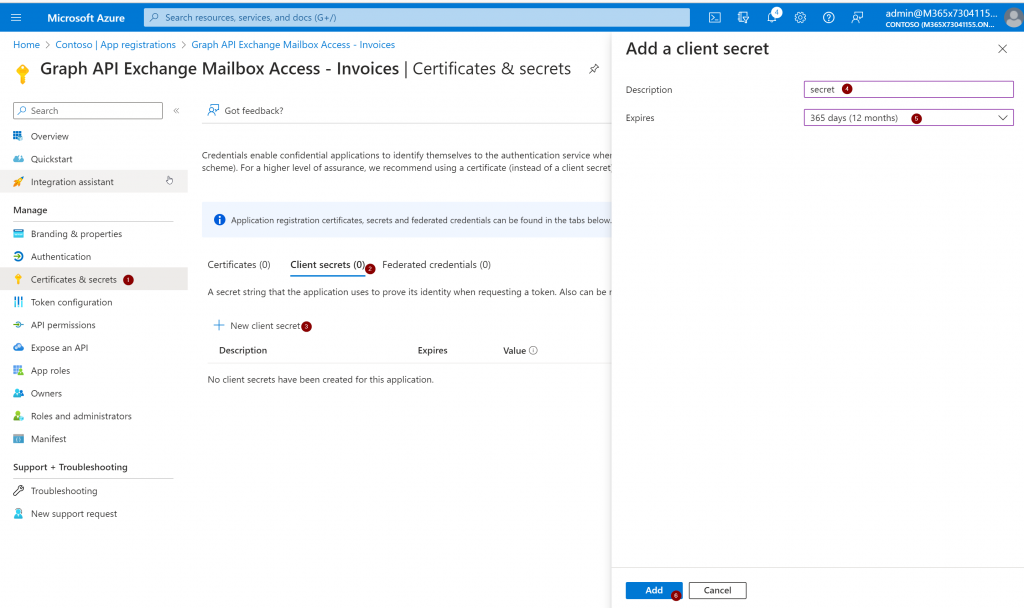 You can use either a certificate or a client secret to authenticate to the created application. For this test we will choose a client secret (because it is easier) but in a production environment it is recommended to go with a certificate because it is more secure! You must give the client secret a name and define how long it is valid for: