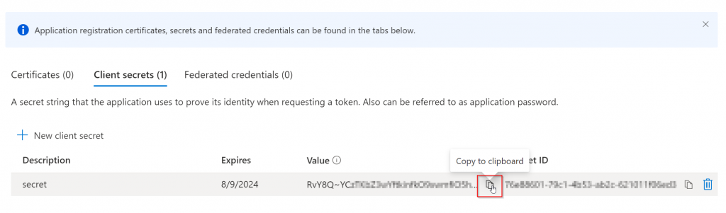 Copy the secret you have created and store it in a secure location, such as a password safe. We will need the secret later for authenticating to the application.