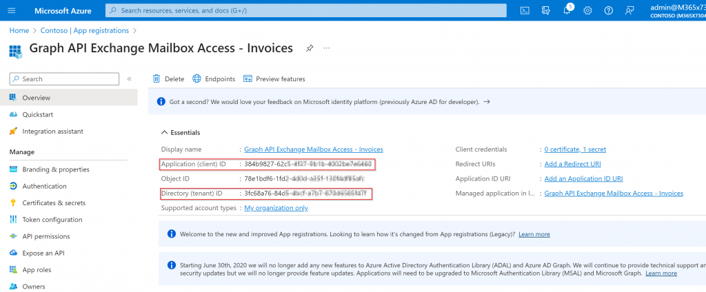 Now switch to the Overview page of the app registration and take a note of the application (client) ID and the Directory (tenant) IT:
