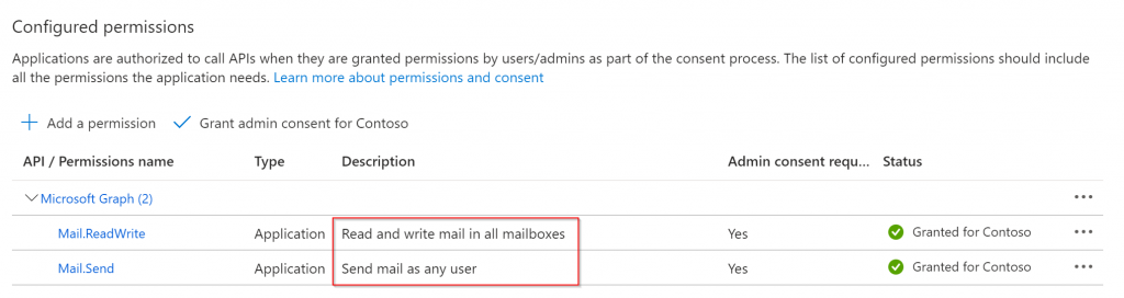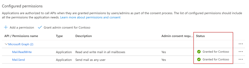 After granting admin consent the status for the permissions will change to “Granted” - if the operation was successfull: