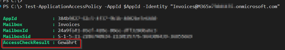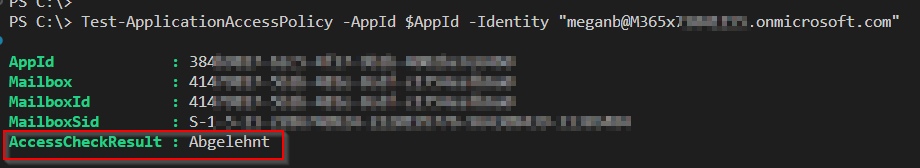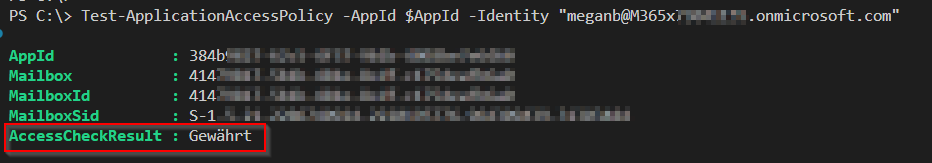 Connect-ExchangeOnline # Application (client) ID $AppId = "324b9727-62c5-9b1b-4f37-4005be8e6562" Test-ApplicationAccessPolicy -AppId $AppId -Identity "meganb@M365x77044157.onmicrosoft.com" The output shows “Gewährt” = “granted” when the access is possible like in the screenshot below: