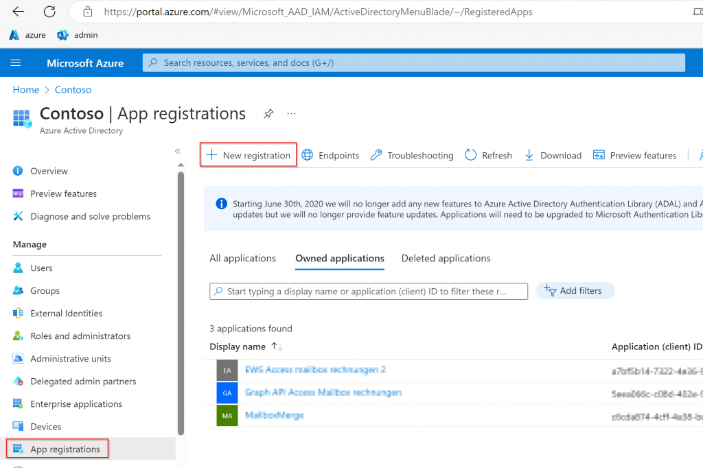 We are creating the Azure AD App Registration for accessing the shared mailbox using the Azure Portal (because for me it is easier that way). Link to App Registration in Azure
