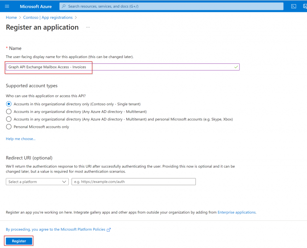 - “Invoices” -> The mailbox that is accessed through this App Registration The rest can be left as is: