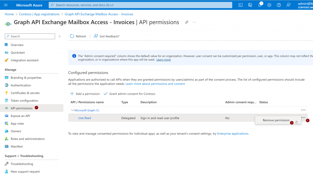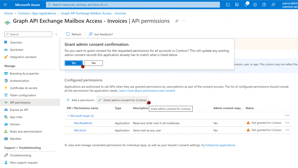 For the granted permissions to become active you must grant tenant-wide admin consent. This is due to the fact that the application will be able to interact with all mailboxes in the tenant. As we just want the application to interact with the Invoice mailbox we will later limit the permissions with an Application Access Policy in Exchange Online. You need a user with one of the following roles assigned (Global Administrator / Priviliged Role Administrator / Cloud Application Administrator or Application Administrator) for this operation: