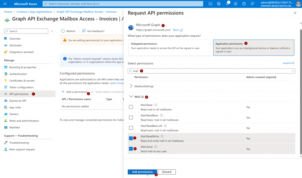 Afterwards you must add the needed Graph API permissions. As we want to logon to the mailbox with an application we must choose “Application permissions” as described in the beginning of this article. For this test we want to be able to read and edit E-Mails in the mailbox (Mail.ReadWrite) and send E-Mails from the mailbox (Mail.Send). So we add the following permissions: