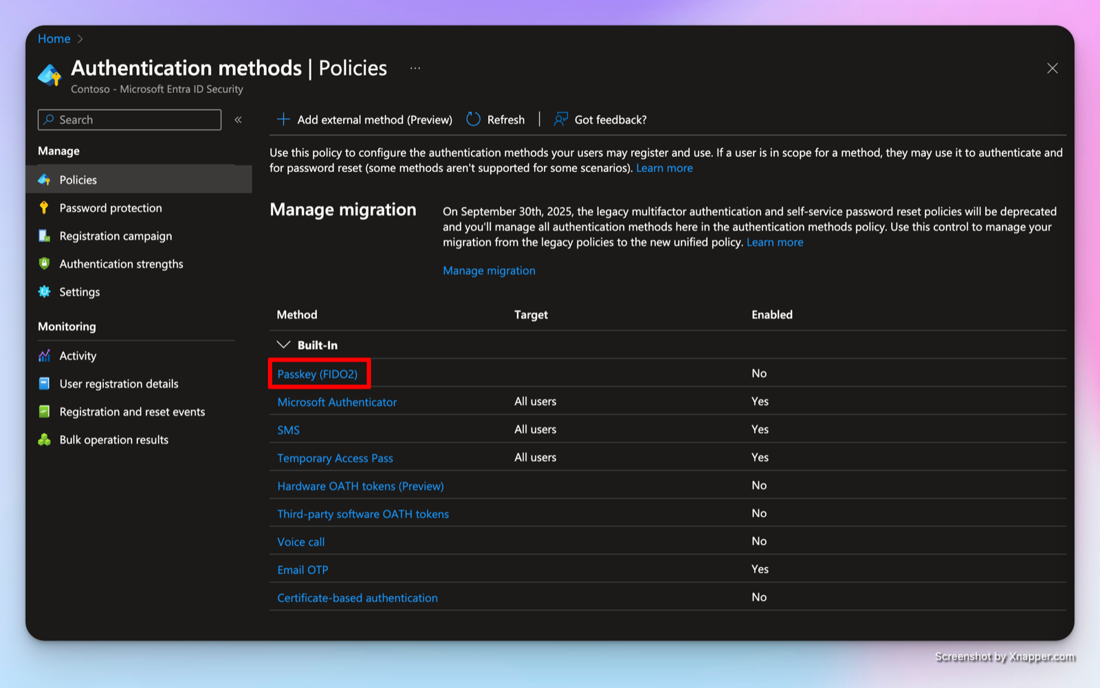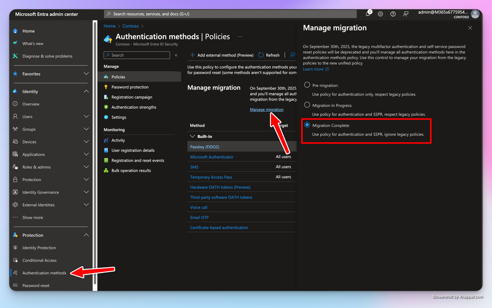 First, you should verify that you have already migrated from per-user MFA to authentication methods policies by clicking Manage Migration in the authentication methods policies. The status should be “migration complete”: