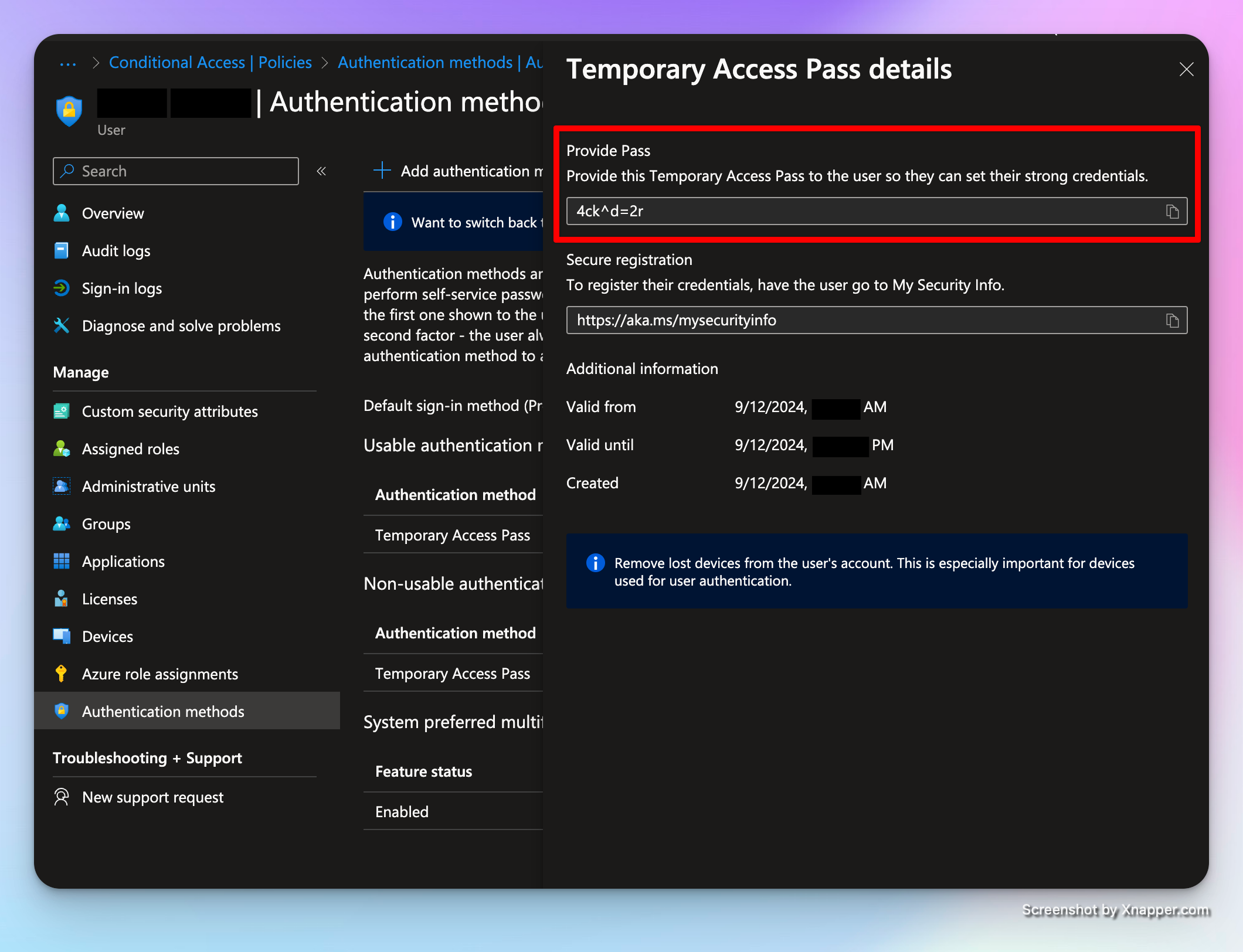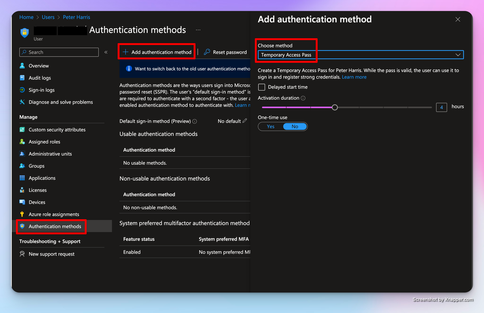 I recommend waiting at least 15 minutes before proceeding, as it takes this time for the FIDO2 authentication method to become available. To register a FIDO2 key, you must log in to the account with a second factor. To accomplish this for the Break Glass account, I recommend creating a temporary access pass (TAP) for this purpose. You can add a TAP under Authentication Methods in a user’s settings: