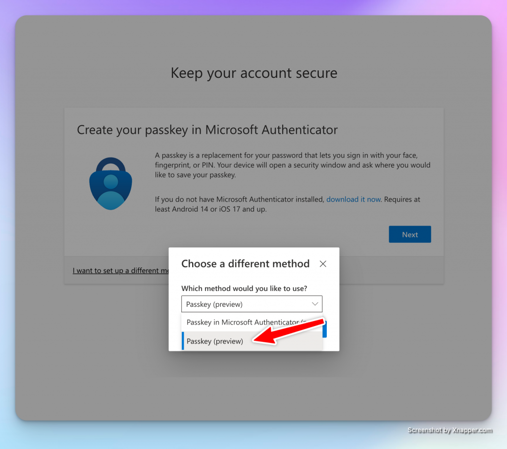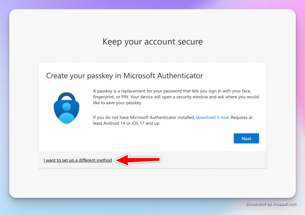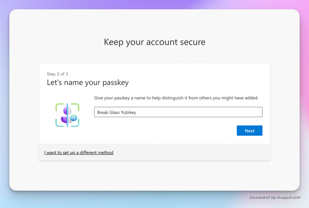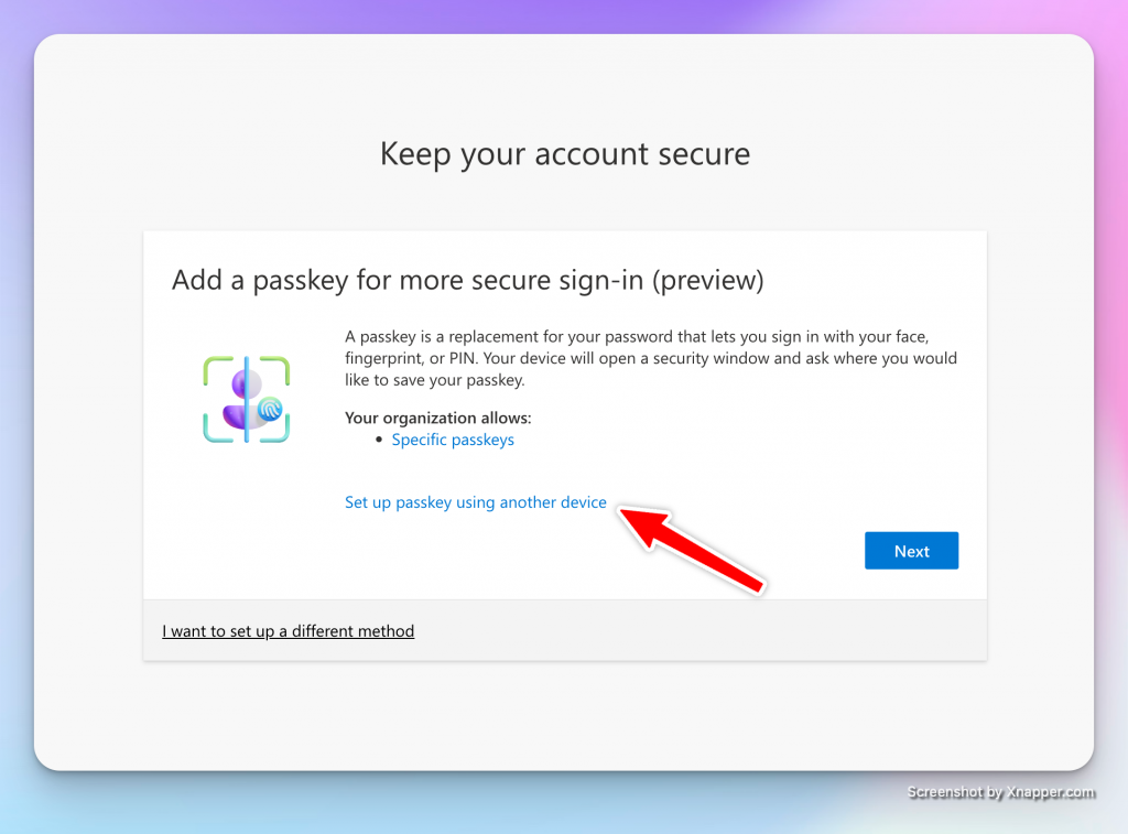 The wizard will guide you to create a passkey in the authenticator application, but we don’t want to do that, so we select “I want to set up a different method”: