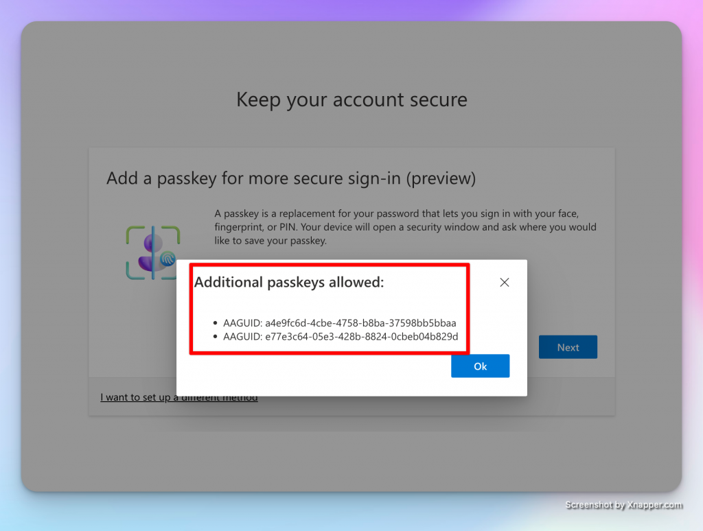 Here you can see a hint that we can only use a passkey with one of the defined AAGUIDs:
