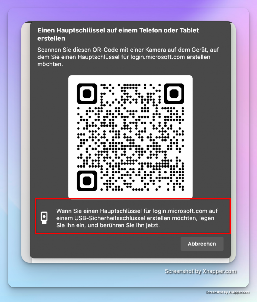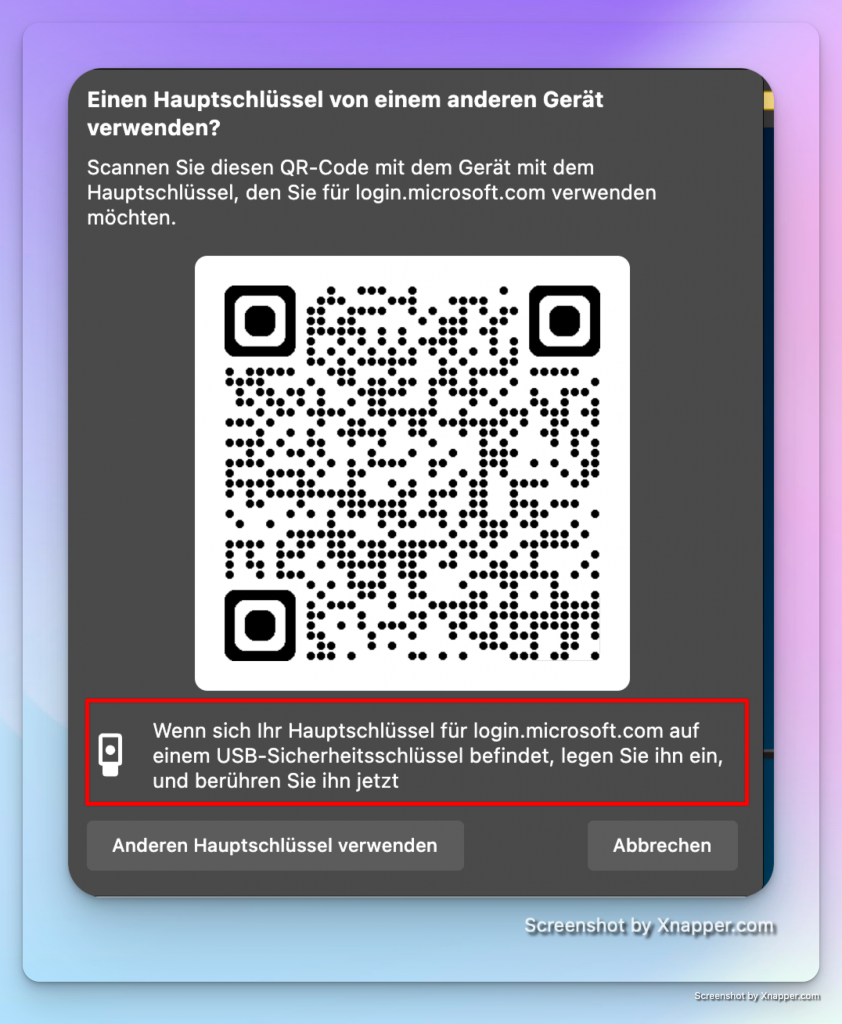 A new window will pop up, asking you to scan the QR code with your phone, but at the bottom you will see a message telling you to insert the USB security key and touch it: