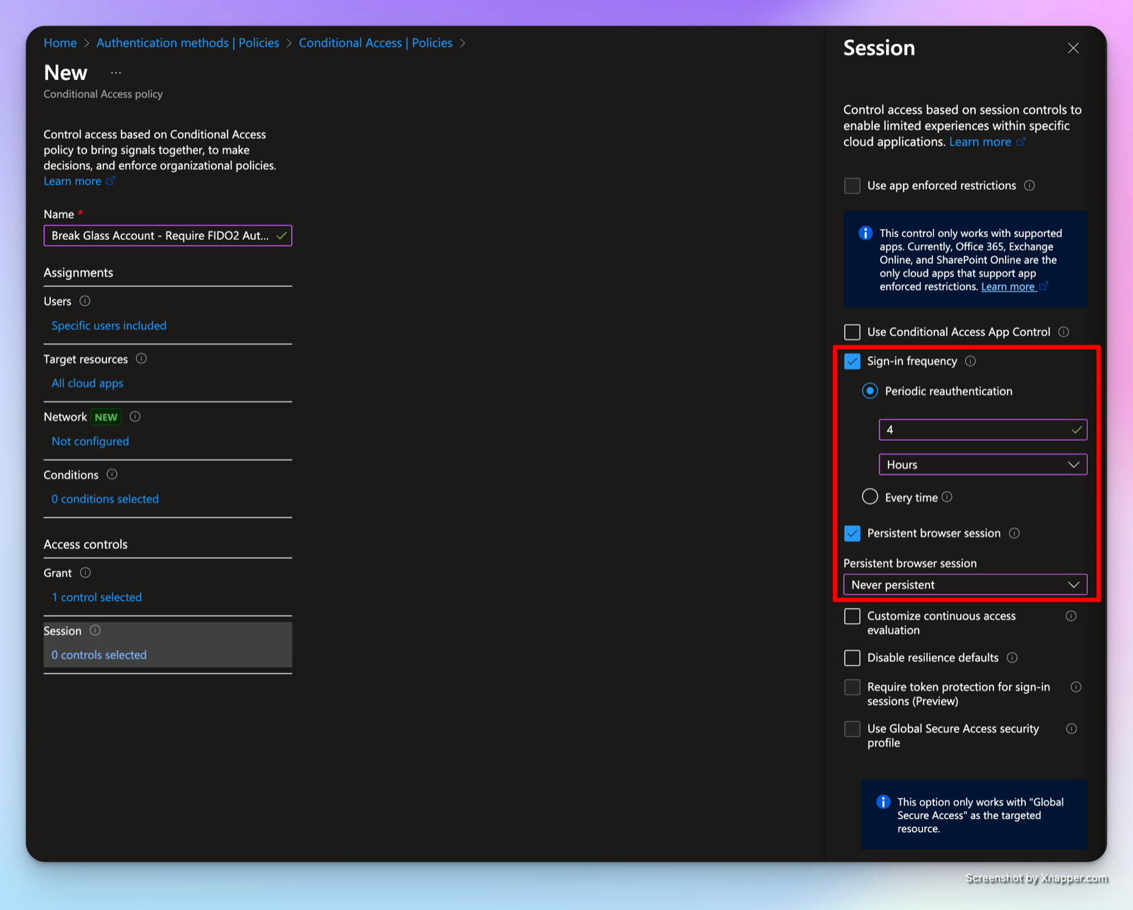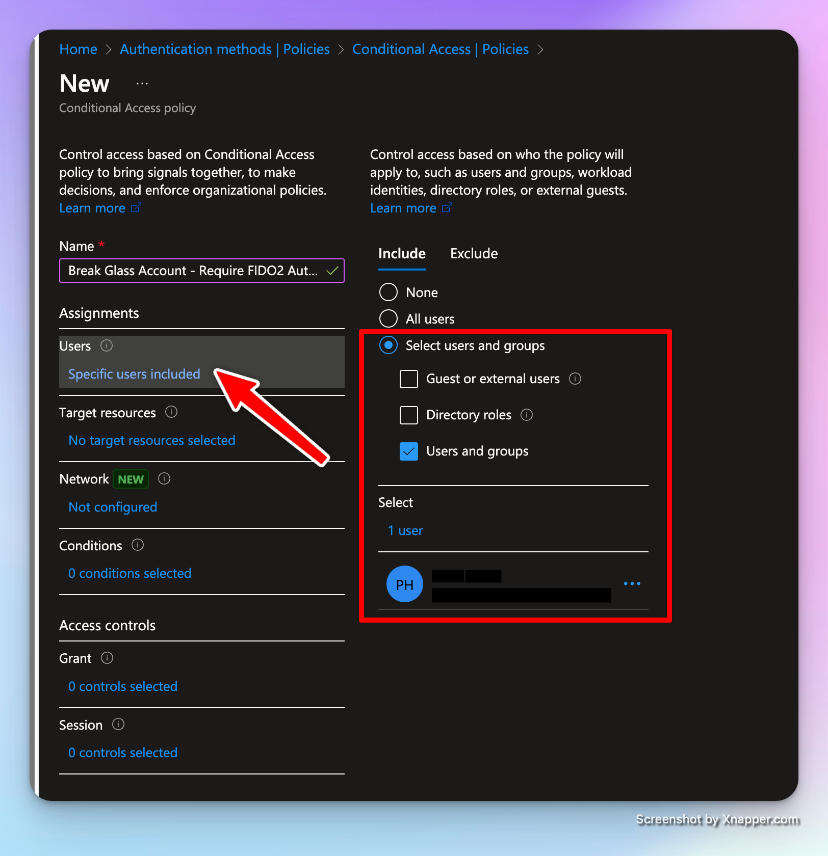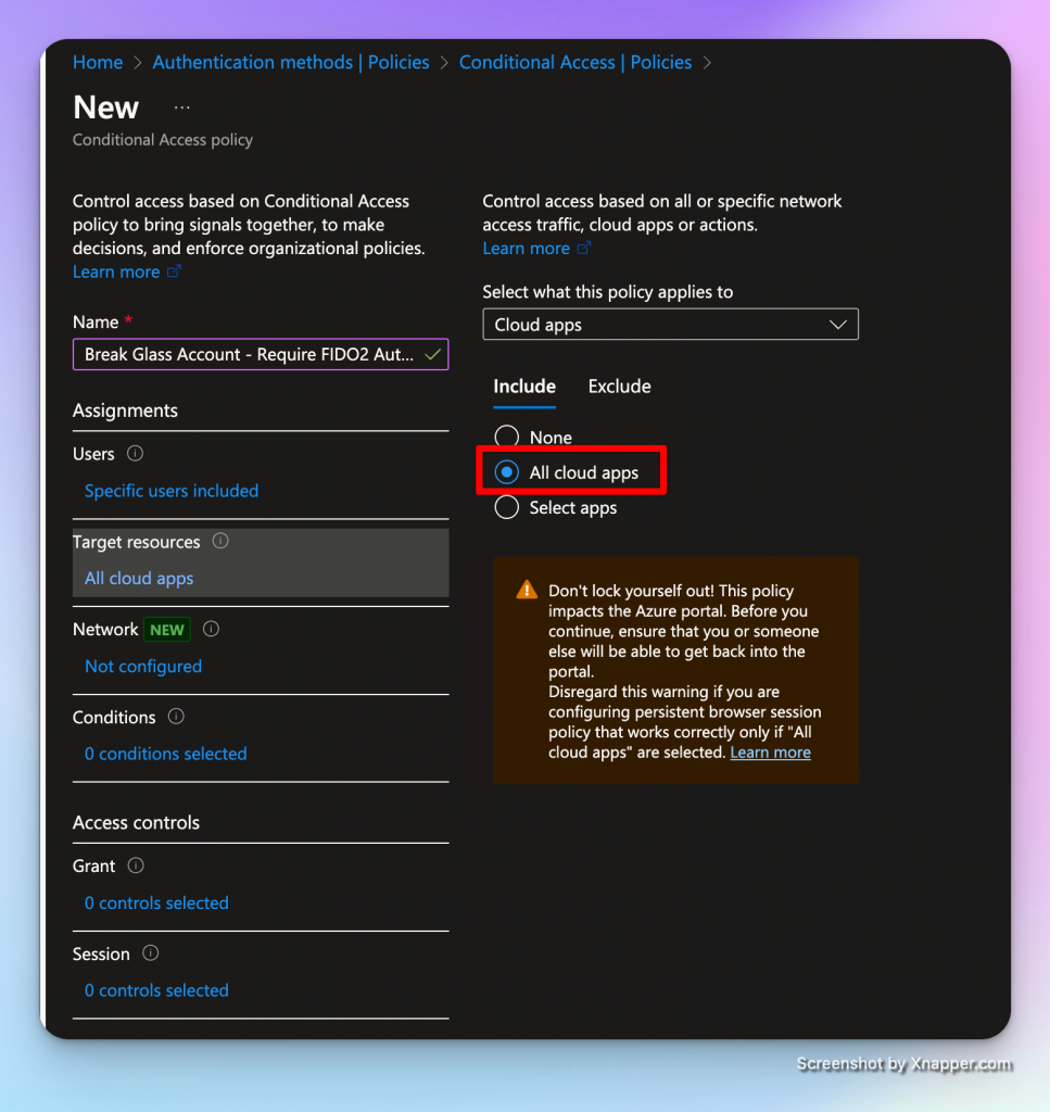 Now you can save the authentication strength, and then create a Conditional Access Policy that forces our Break Glass account to use the newly created FIDO2 authentication strength. We will restrict it to the break glass account only: