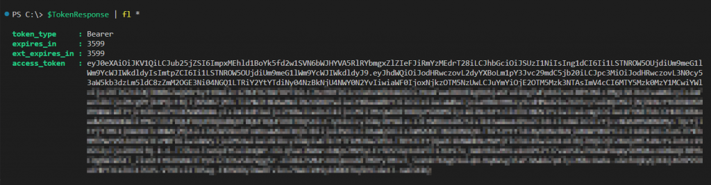 What we will need for our final request to the resource is the access token found within the $TokenResponse variable shown in the screenshot above.