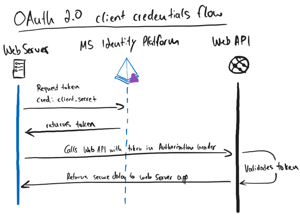 As a first step, the application sends a request to the Microsoft Identity Platform to authenticate using the client secret. Once the request is validated, the Identity Platform sends a token back to the application. The application can use this token for subsequent requests to the resource, by adding it to the authorization header. The resource validates the token, and upon successful validation, sends the secure data back to the application.
