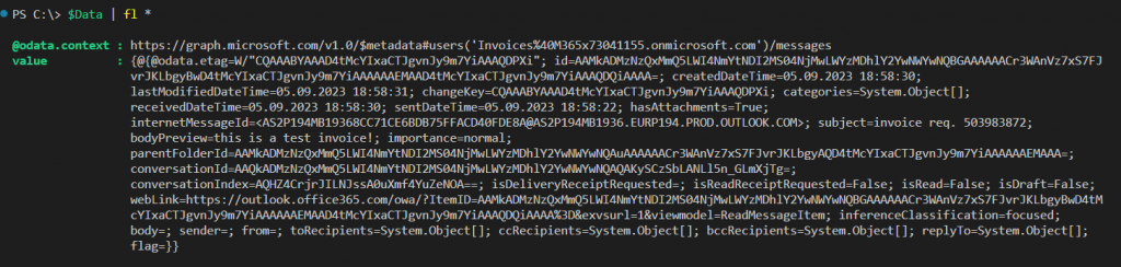 # request and write the response to a variable $apiUrl = "https://graph.microsoft.com/v1.0/users/$mailbox/messages/" $Data = Invoke-RestMethod ` -Headers @{ Authorization = "Bearer $($Tokenresponse.access_token)" } ` -Uri $apiUrl -Method Get Working with the response