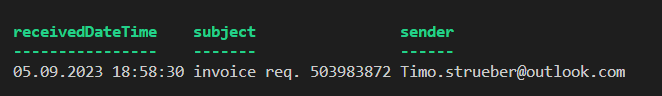 # formated output of the mails $mails = $Data.Value $mails | select-object receivedDateTime,subject, ` @{ label='sender'; expression={($_.sender.emailAddress.address)} } Summary