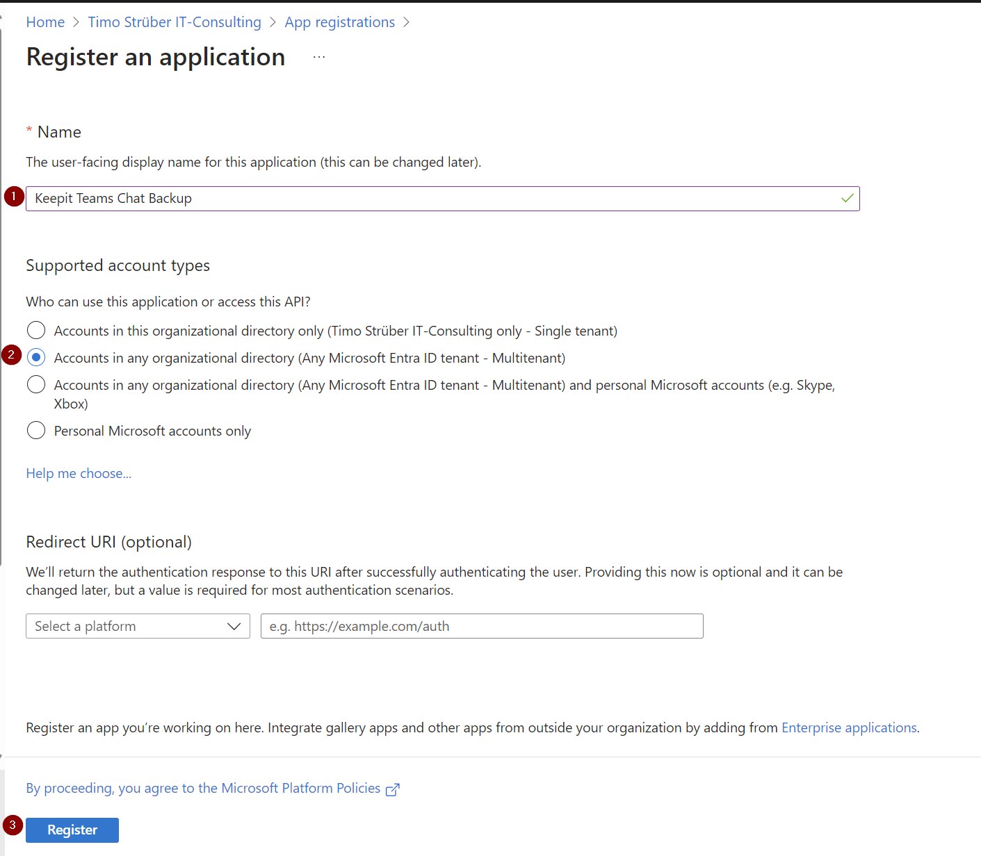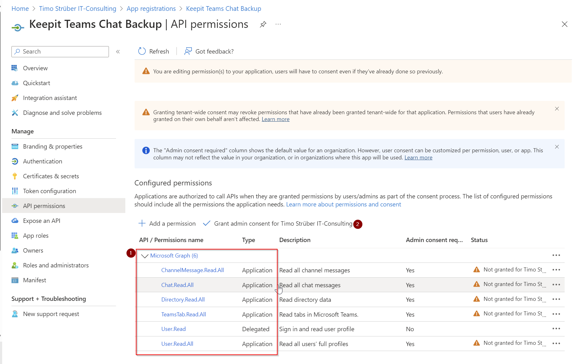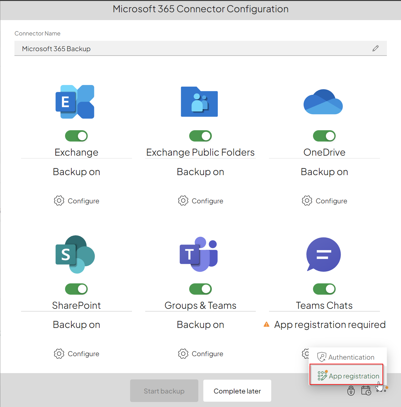I also turned on “Teams Chats.” To start the backup, you’ll need to add the app registration.