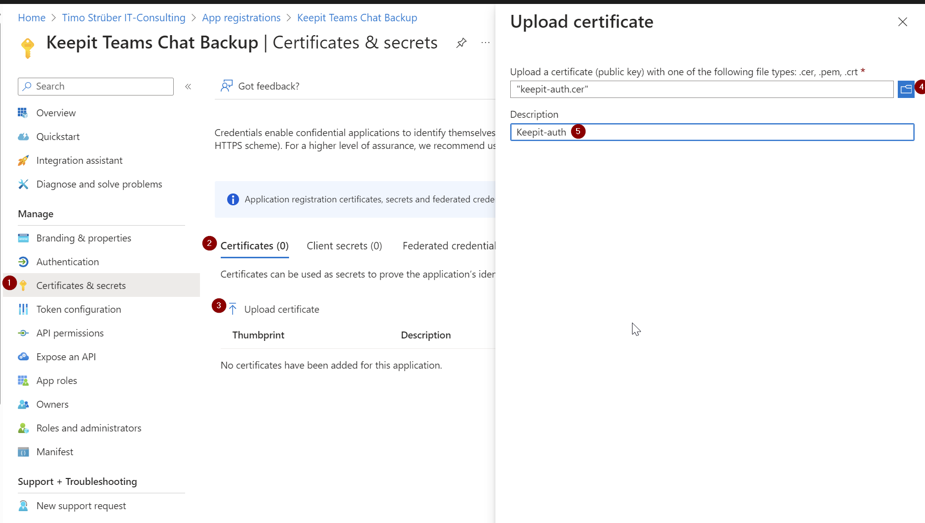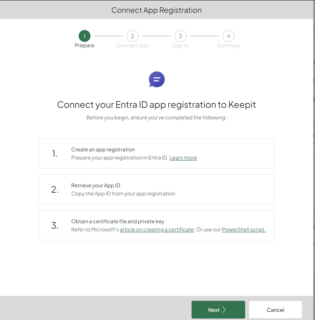 Keepit will authenticate to your Microsoft 365 environment using a managed identity and certificate. To do that, you’ll need to create an app registration first.