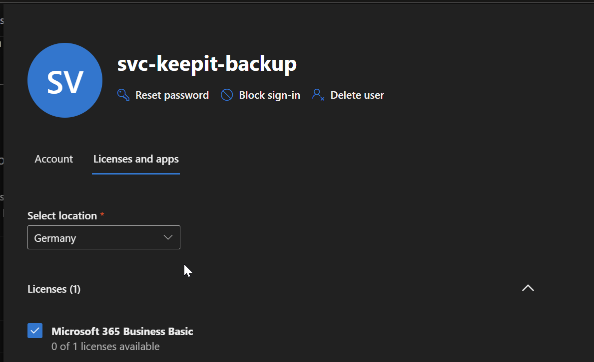 Second, you’ll need a licensed service account for Keepit Backup to process the data in your tenant. To keep costs down, I bought a Microsoft 365 Business Basic license for that purpose.