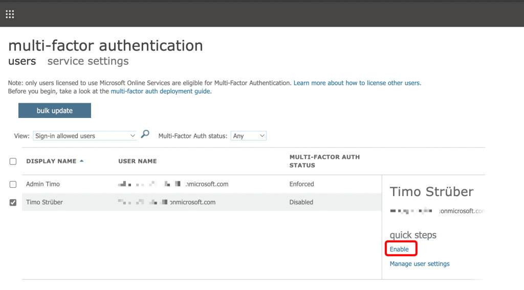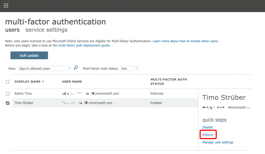 Now I will enable and enforce MFA for all my users from a administrative perspective: