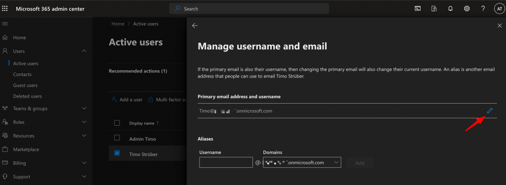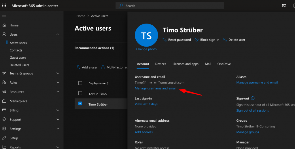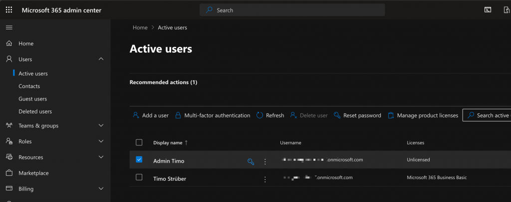 In my Tenant I changed the username of the initial created user account and removed his automatically assigned license. The admin account does not need to be licensed because it is only used for administrative purposes. Afterwards I created the first normal user account in the tenant and assigned a license: