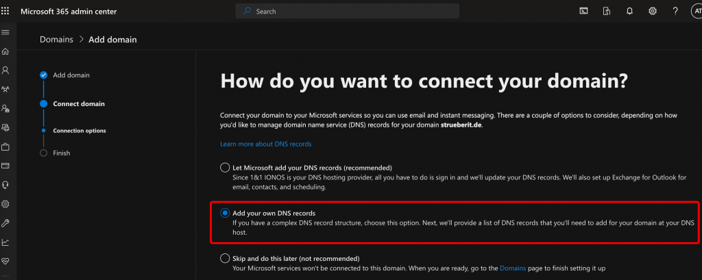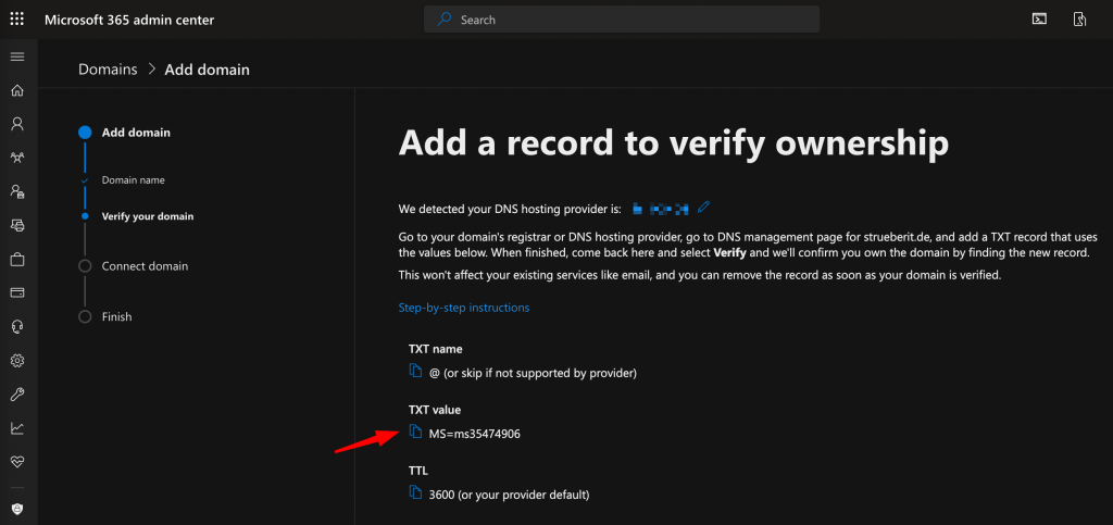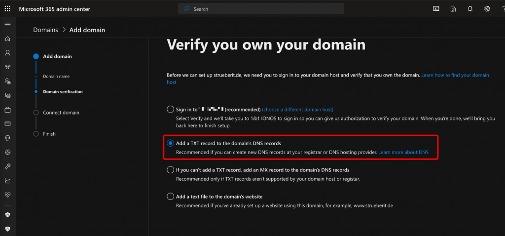 The wizard will walk you through the process. First, you have to enter your domain name. Then, you’ll need to verify that you’re the owner of the domain. Some DNS providers have an interface where you can allow Microsoft to log on to your DNS provider and create the required TXT record. I wanted to have control over the process, so I chose to create a TXT record manually: