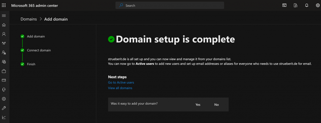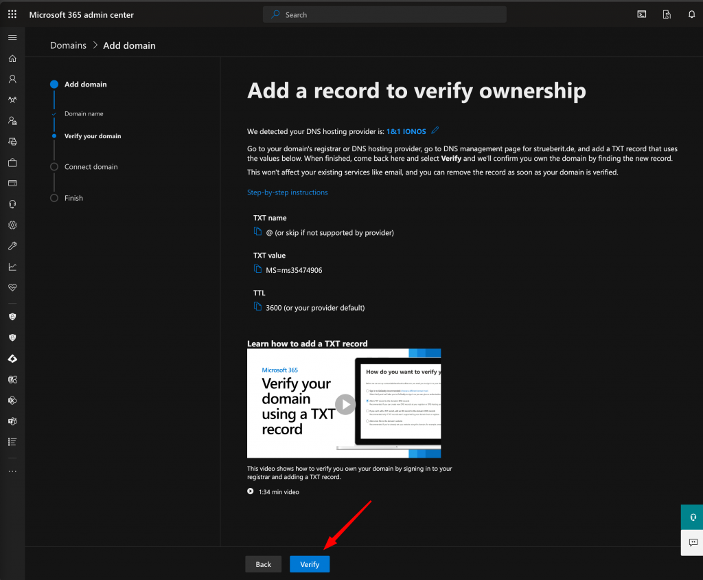 Then you went back to the Microsoft 365 Admin center and verify your domain: