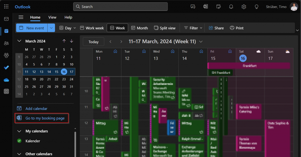 To begin using Bookings with me, open the Outlook web app, switch to your calendar view, and click on ‘Go to my booking page’:
